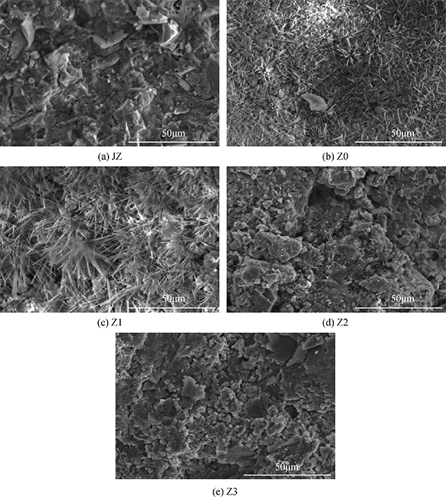 混凝土试样在水养护环境下浸泡28 d后裂缝处自愈合产物的微观形貌。