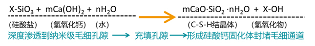 自愈型无机增殖防水剂的防水机理是借助水和反应物氢氧化钙,生成硅酸钙晶体。遏止了游离态氢氧化钙流失的同时,随着胶体不断繁殖的作用填充了水通道空隙部分,形成了高密性不透水躯体结构,从而达到结构防水之效果。