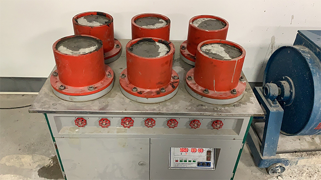 将到达龄期的试块取出后,放入抗渗模具中用硅胶密封无透水状态,利用抗渗仪加压观察试块的透水情况,并记录透水时的压力值。